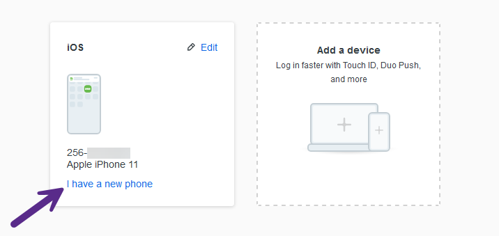 Click on the "I have a new phone" link for your current mobile phone. Click the "Get started" button on the next screen to connect your new phone to Duo Mobile. Please note that if you are adding another mobile phone number, you will need to click on the "Add a device" option on the previous screen.